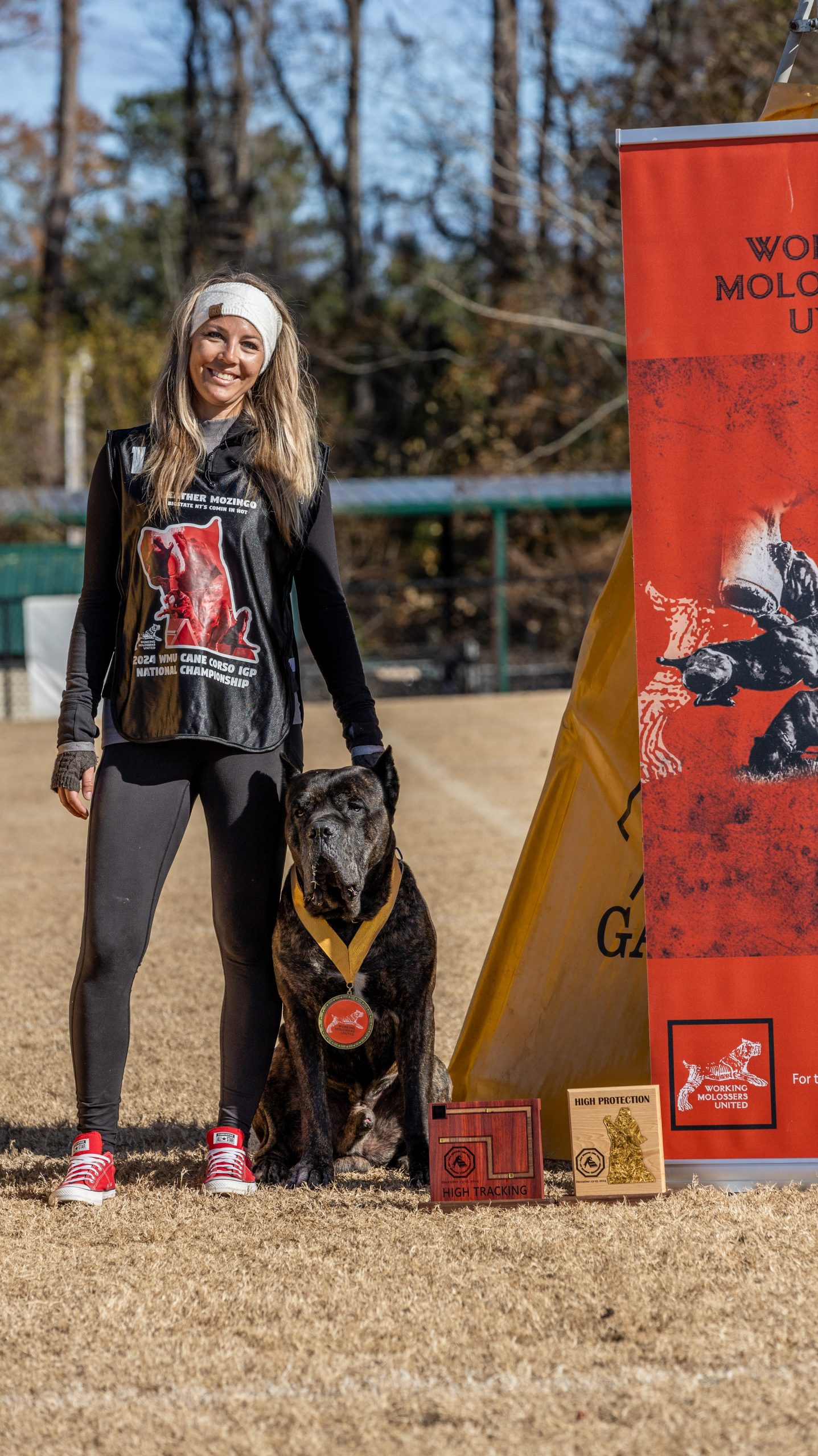 Beyond pet dog training, Heather is a national-level competitor in IGP (Schutzhund). Her Cane Corso, Vinny, has earned BH, FH, IGP I, IGP II, and IGP III titles — and placed 1st at the 2023 and 2024 Cane Corso IGP National Championship. Fewer than 100 Corsos in the world hold an IGP title.